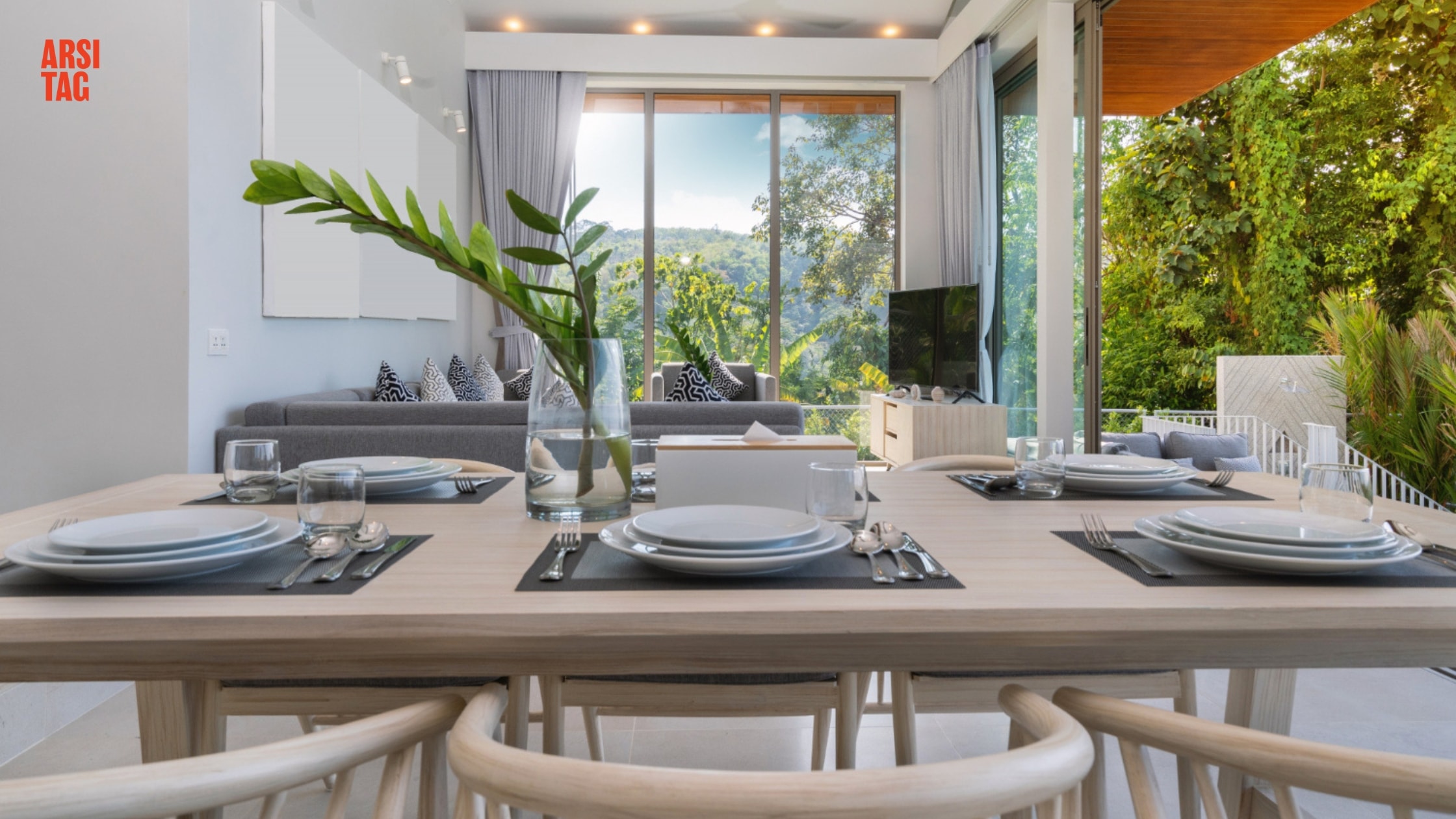 Gaya modern tropis identik dengan nuansa alami dan hangat. Meja makan berbahan kayu solid dengan finishing natural adalah pilihan yang sempurna. Padukan dengan kursi makan berdesain ramping atau aksen rotan untuk memperkuat kesan tropis yang modern dan menyegarkan.